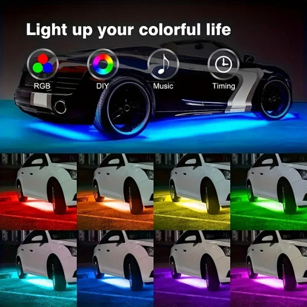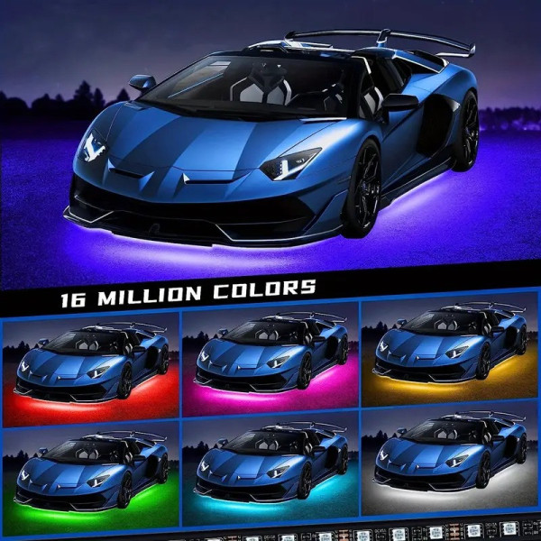 LED-підсвітка дна автомобіля з керуванням через Bluetooth — стильне та функціональне рішення для тюнінгу салону та днища авто. Комплект містить чотири стрічки завдовжки 90 і 120 см, пульт керування та вбудований звуковий контролер, що дає змогу підсвітці реагувати на музику. Понад 16 мільйонів кольорів і 8 режимів роботи (плавні переходи, миготіння, синхронізація з ритмом) створюють динамічне освітлення й унікальну атмосферу.