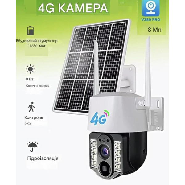 Автономна 4G камера відеоспостереження V380 PRO VC3 із сонячною панеллю й акумулятором 18650, 4 МП, поворотна, біла