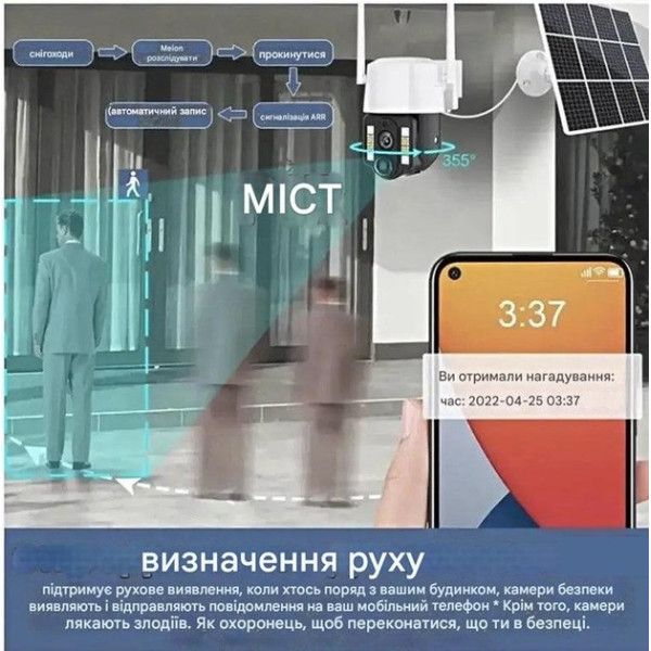 Камера обладнана широким кутом огляду та механізмом повороту: горизонтально 90°, вертикально 120°, що дає змогу контролювати територію на 355°. Висока роздільна здатність Full HD 1080P забезпечує чітке зображення вдень і вночі. Інфрачервона підсвітка та кольорове нічне бачення дають змогу фіксувати події навіть у повній темряві.