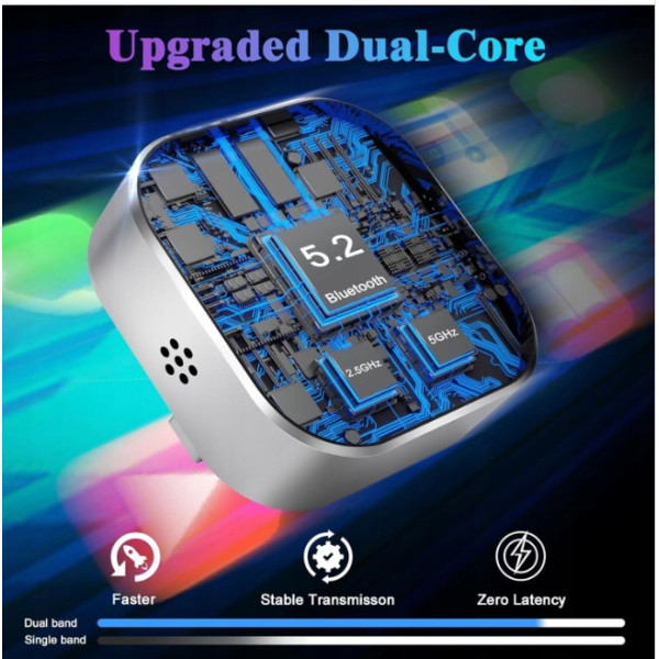 Пристрій обладнаний вдосконаленою системою Bluetooth 5.2 і дводіапазонним модулем Wi-Fi (2,4 ГГц + 5,8 ГГц), що гарантує стабільне та швидке з'єднання, мінімальні затримки та миттєву реакцію. Після первинного настроювання адаптер автоматично під'єднується до вашого під час кожного запуску автомобіля, забезпечуючи зручність і економію часу.