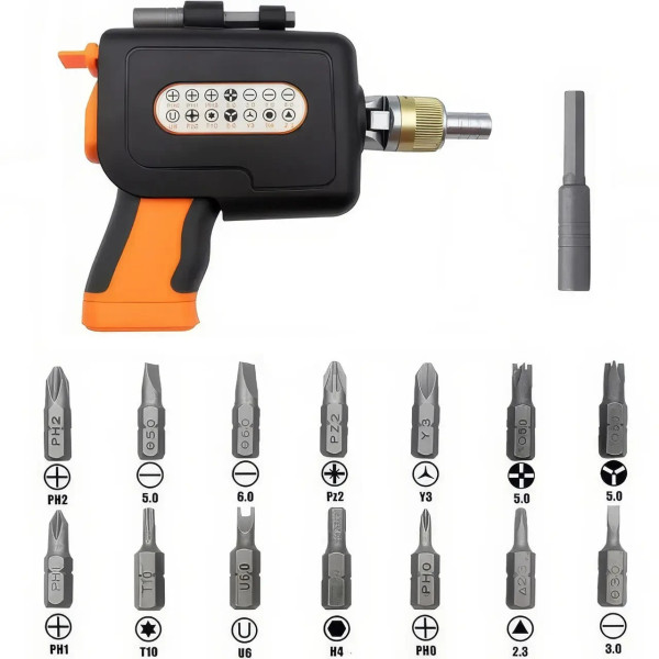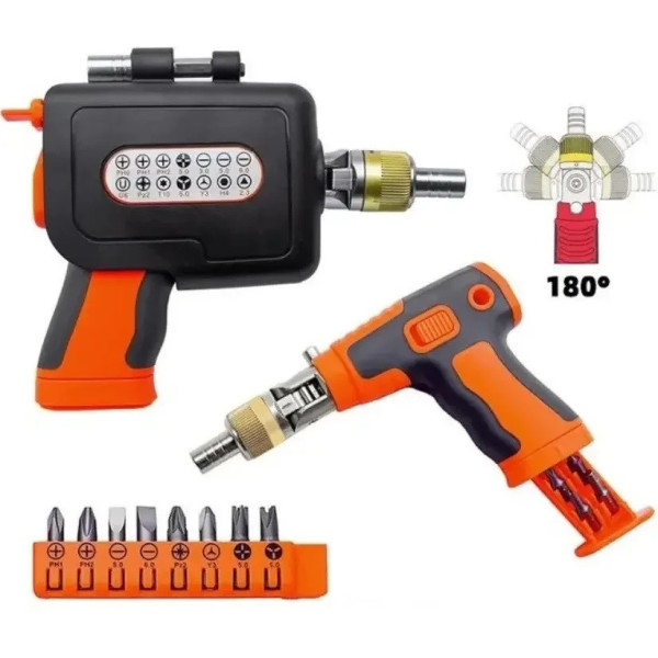 Багатофункціональна викрутка 2882A — це універсальний інструмент, розроблений для зручної та швидкої роботи з різними типами кріплення. Її пістолетна форма та храповий механізм роблять процес загвинчування й відгвинчування максимально легким і комфортним. Зручний механізм обертання головки на 180° дає змогу без зусиль працювати навіть у важкодоступних місцях, а магнітні наконечники запобігають втраті болтів і шурупів.