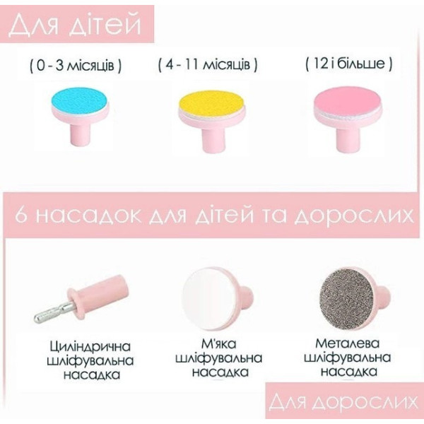 Електричний тример для нігтів 6 в 1 призначений для безпечного й акуратного підстригання й полірування нігтів на руках і ногах у дітей і дорослих. М'які насадки та регулювання швидкості дають змогу працювати без пошкодження кутикули та нігтьового ложа.