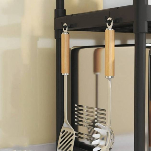 Міцна металева конструкція витримує щоденні навантаження й забезпечує довгий термін експлуатації. Дворівнева система дає змогу ефективно використовувати вертикальний простір, а бічні гачки дають можливість підвісити кухонні інструменти, прихватки або рушники.