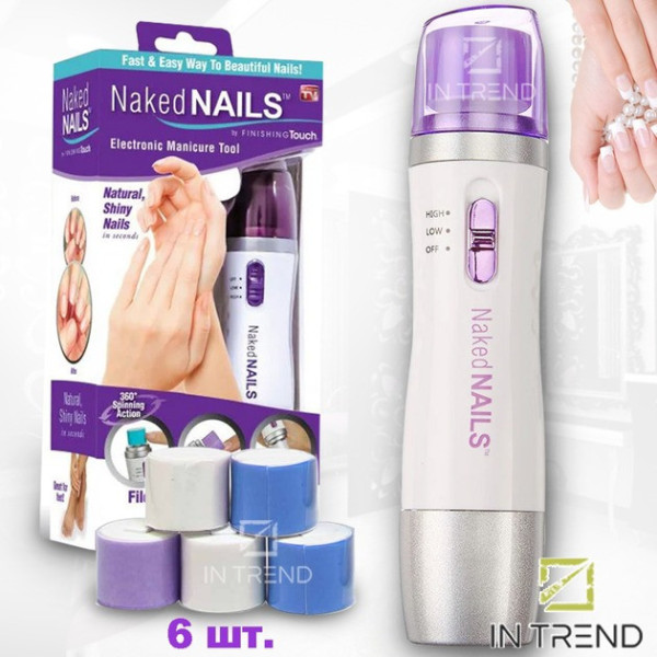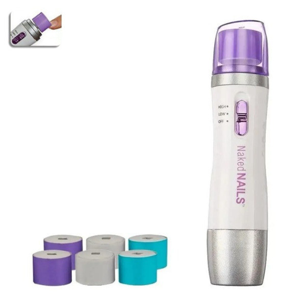 Машинка для шліфування та полірування нігтів Naked Nails — це зручний і безпечний інструмент для домашнього манікюру, який допомагає досягти професійного результату без візиту в салон. Пристрій працює від двох батарейок AA та обладнане 6 змінними роликами з колірним маркуванням для різних етапів догляду: сині — для шліфування та видалення нерівностей, фіолетові — для м'якого полірування, білі — для фінального блиску та сяйва.