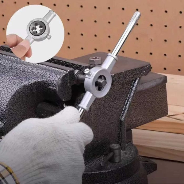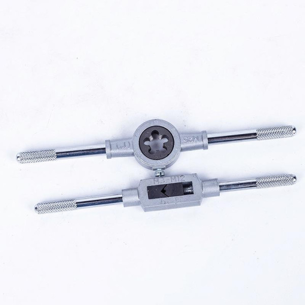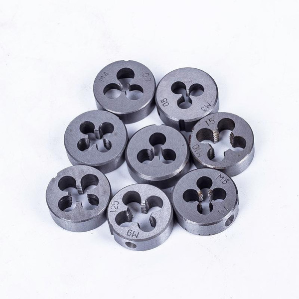 Плашки (9 шт.): 3x0.5, 4x0.7, 5x0.8, 6x1.0, 7x1.0, 8x1.25, 9x1.25, 10x1.5, 12x1.75
