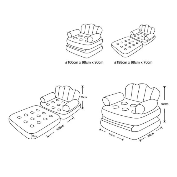 Надувний диван-трансформер Bestway 67356 — універсальне рішення для дому, дачі та відпочинку на природі. Ця модель поєднує в собі комфорт, практичність і мобільність. Завдяки п'яти варіантам трансформації диван легко перетворюється на шезлонг, ліжко або зручне спальне місце.