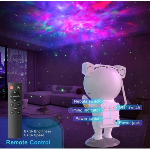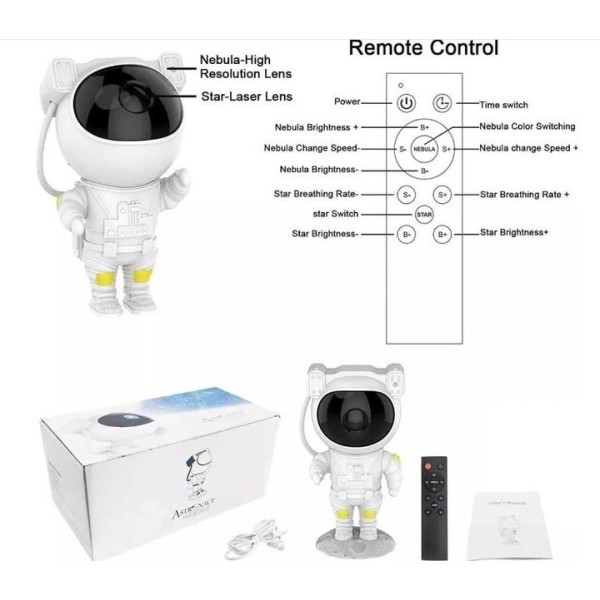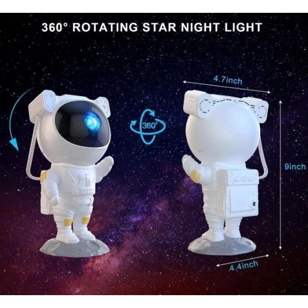 Лазерний проєктор у формі астронавта поєднує функції нічника, іграшки та музичного пристрою. Він перетворює кімнату на чарівний космічний світ, проєктуючи на стіни та стелю вісім яскравих зображень галактики. Шолом астронавта дає змогу регулювати кут проєкції, а обертова голова на 360° з магнітною тягою забезпечує будь-який напрямок зоряного неба.