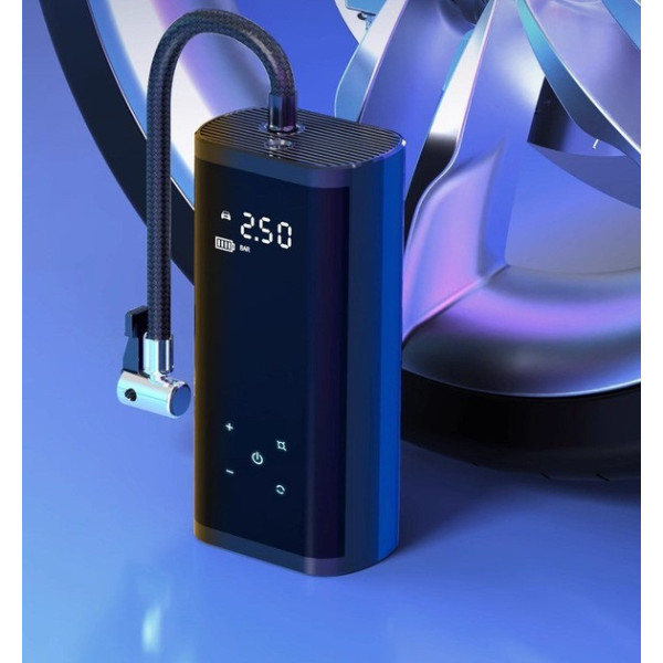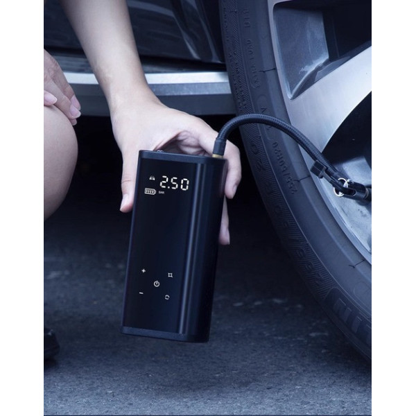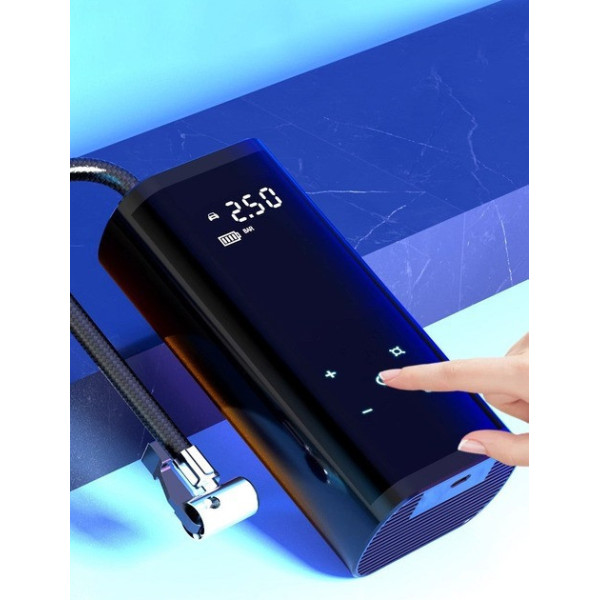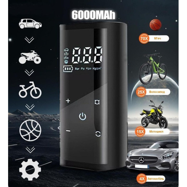 Портативний акумуляторний компресор Tire Air Compressor — зручний пристрій для накачування автомобільних і мотоциклетних шин, велосипедів, а також м'ячів, матраців та інших надувних виробів. Завдяки високій продуктивності до 25 л/хв він швидко відновлює необхідний тиск, а вбудований акумулятор ємністю 6000 мА·год забезпечує до 30 хвилин автономної роботи.