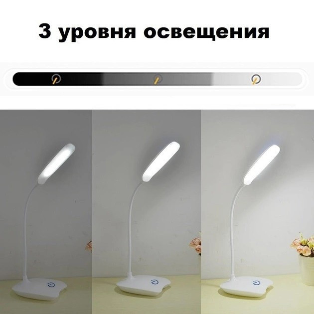 Имеет 3 уровня освещения, а также гибкий держатель, благодаря которому можно регулировать световой поток.