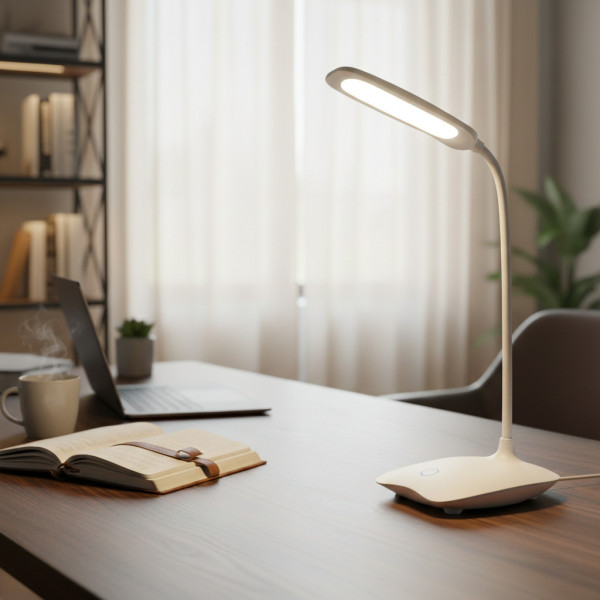 светодиодная настольная лампа с аккумулятором выполнена в пластиковом корпусе в стиле hi-tech, а также оборудована сенсорной кнопкой управления.