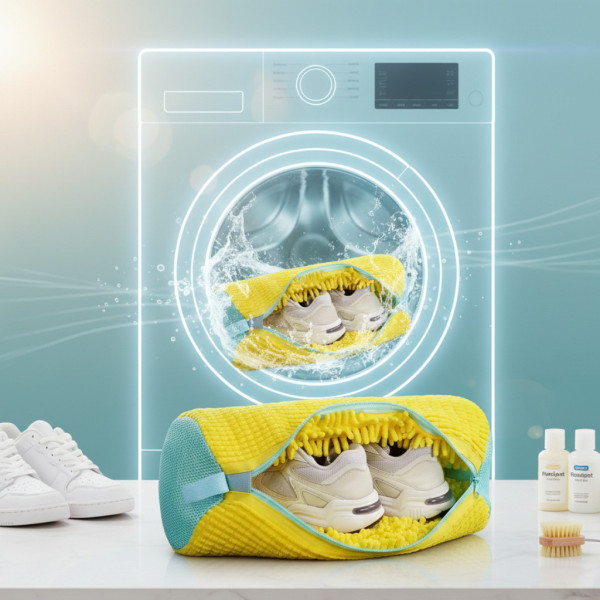 - Защита стиральной машины: Мешок предотвращает удары и поломки барабана, оберегая стиральную машину от повреждений, которые могут возникнуть из-за твёрдых элементов обуви, таких как подошвы или застёжки.