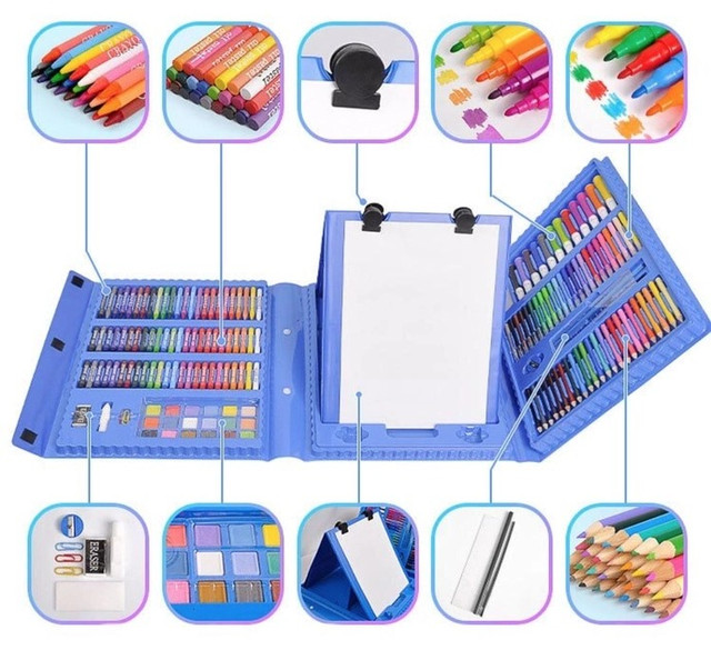 Большой художественный набор отлично подойдет для начинающего рисовать. В нем есть 208 предметов на все случаи: несколько видов карандашей, фломастеры, краски, ребенок сможет попробовать все стили прорисовки, при этом вы не потратите лишние деньги.