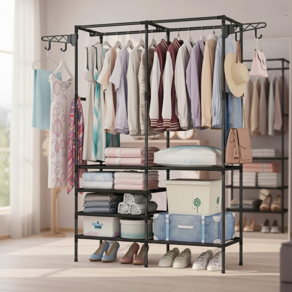 12 прочных крючков с закруглёнными краями обеспечивают надежную фиксацию одежды без повреждений ткани.