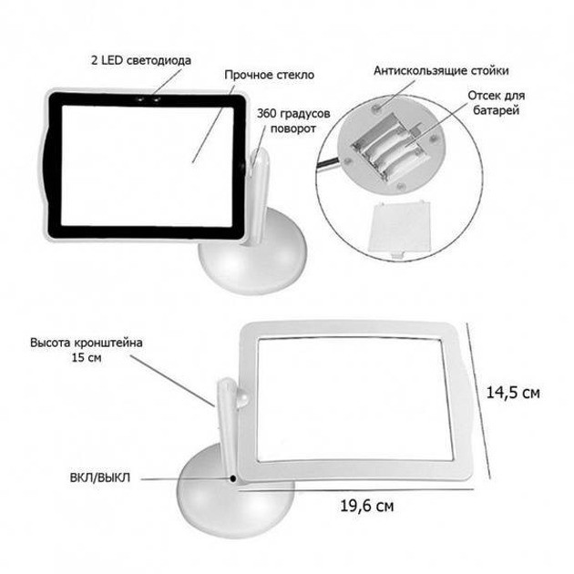 С настольной лупой людям со слабым зрением будет удобнее читать любимые книги и решать кроссворды. Отлично подходит для мелких работ, проверки текстовых сообщений, вязания или крохинга и др. В лупе встроенная светодиодная подсветка для кристально чистого изображения. Подсветка работает от батареек (в комплект не входят).