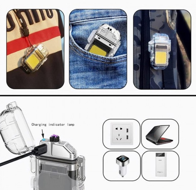Зажигалка электроимпульсная с фонариком и дисплеем. Электроимпульсная USB зажигалка работает совершенно по другому принципу, чем привычные нам газовые, бензиновые или электронные зажигалки с пружиной накаливания. Между двумя контактами создается мощный электроимпульсный разряд (как в змейке), который зажигает абсолютно любые предметы