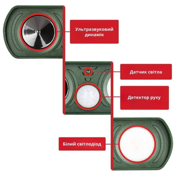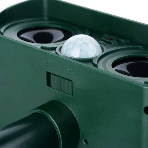 Модель обладнана двома динаміками, що підвищує ефективність впливу. Пристрій активується автоматично за допомогою вбудованого пасивного інфрачервоного датчика руху, який фіксує присутність тварин у радіусі до 10 метрів.