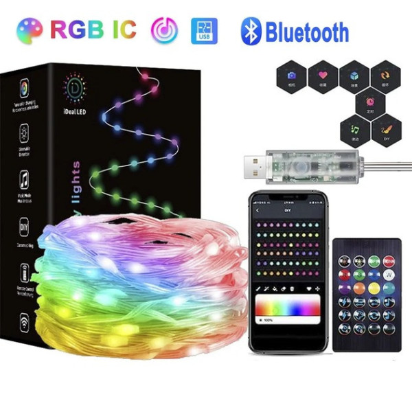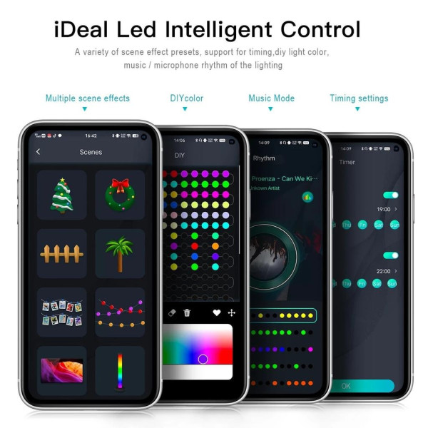 Кожен світлодіод WS2812B RGBIC має незалежне управління, що дає змогу програмувати комбінації, ефекти «повнокольорового потоку води», фіксовані режими та інші динамічні світлові сценарії. Управління здійснюється через додаток Bluetooth або ІЧ-пульт дистанційного керування, а також доступна синхронізація зі звуком — світло змінюється в такт музиці.