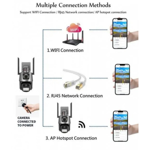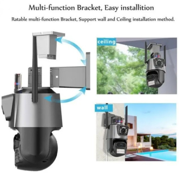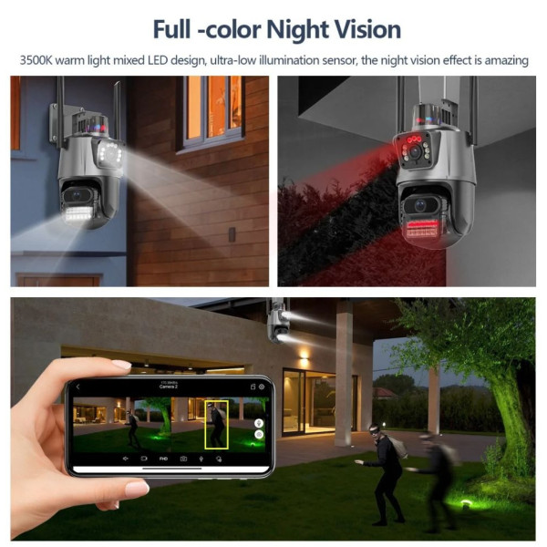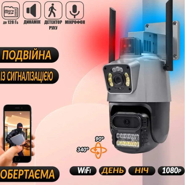 Вулична Wi-Fi камера Dual Lens 6MP — це надійне рішення для цілодобового відеоспостереження вдома, офісу або бізнесу. Завдяки подвійному об'єктиву та високій роздільній здатності камера забезпечує широкий кут огляду та деталізоване зображення навіть вночі.