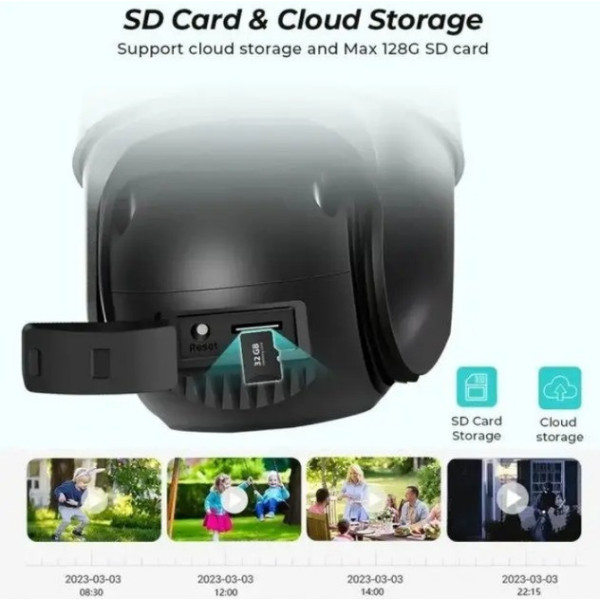 Корпус камери захищений за стандартом IP66, що робить її стійкою до дощу, пилу та перепадів температури. Під'єднання здійснюється через WiFi або кабель RJ45, а запис зберігається на SD-карту або в хмару. Керування й перегляд відбуваються через зручний мобільний застосунок V380 Pro.